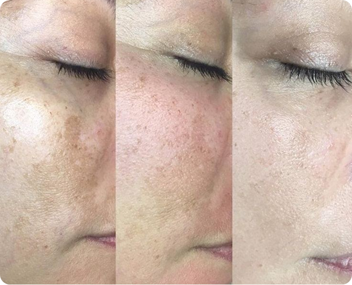 away, revealing clear, even-toned skin underneath.